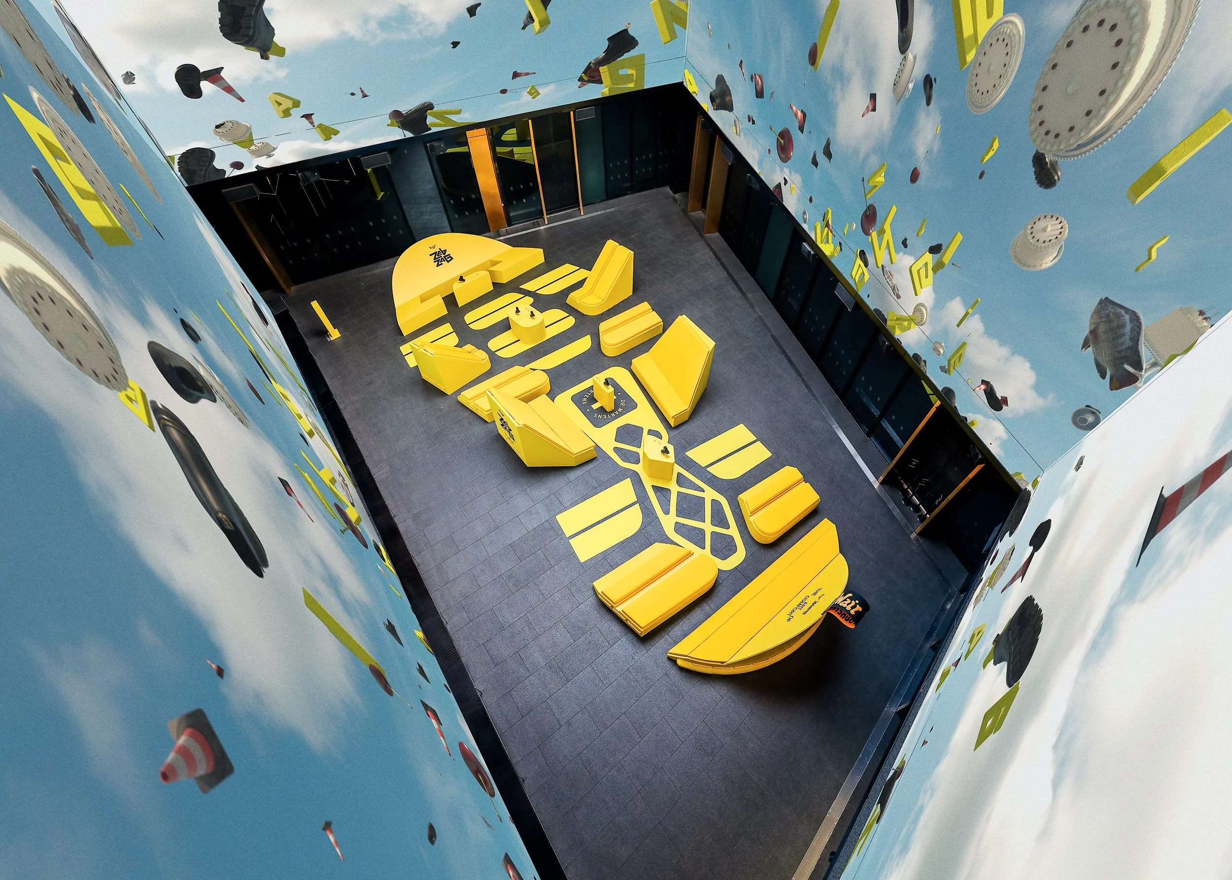 After taking 2D and 3D scans of the Zebzag sole, we extruded it into large-scale sculptural forms, creating a landscape of seating, platforms, and surfaces. Low and high-angled seating invited people to pause and dwell, while product plinths, carved directly from the sole’s geometry, anchored the space and spotlighted key features of the boot.